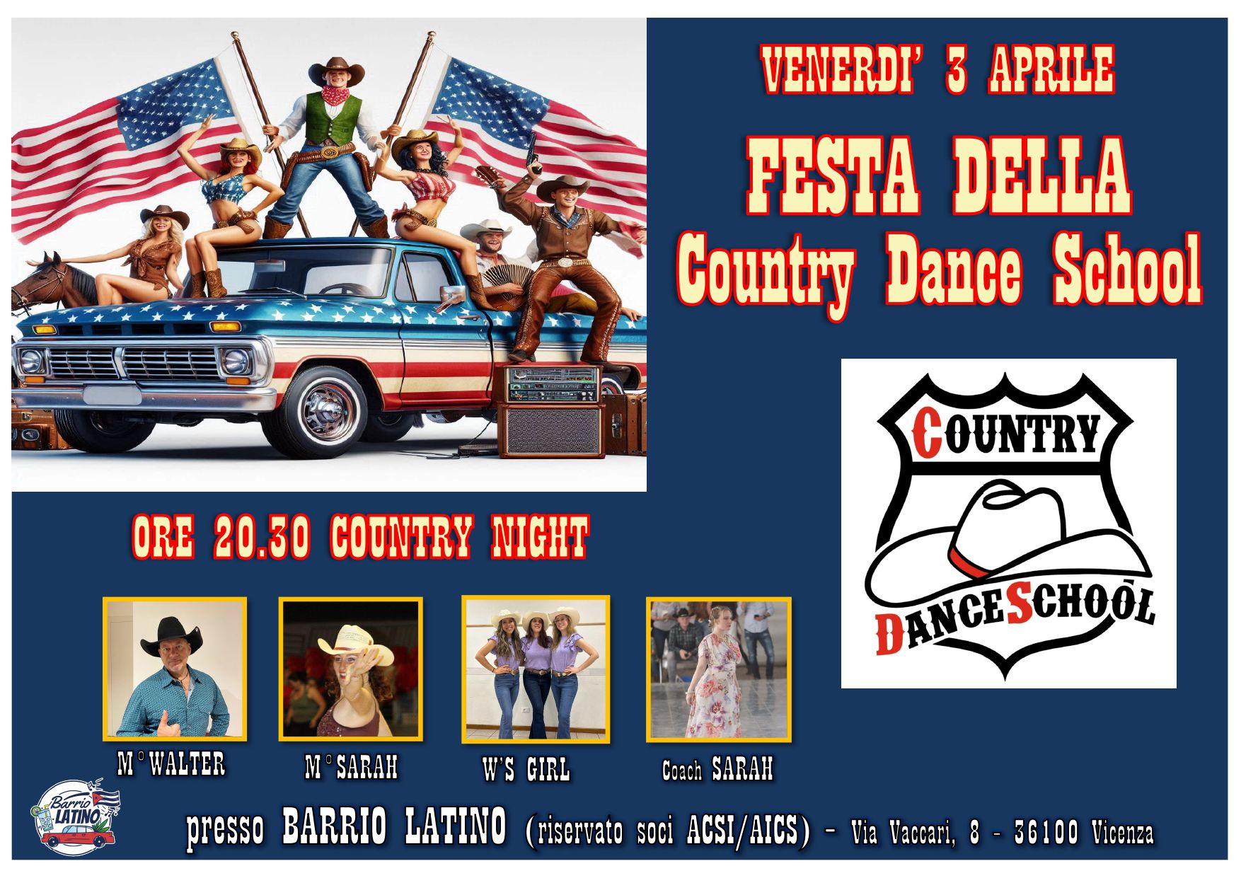 Special Country Night al Barrio Latino Vicenza per festeggiare la Country Dance School sotto la direzione artistica del Maestro Walter Nampelli. Special Guest le W’s Girls e la Maestra Sarah e Coach Sarah