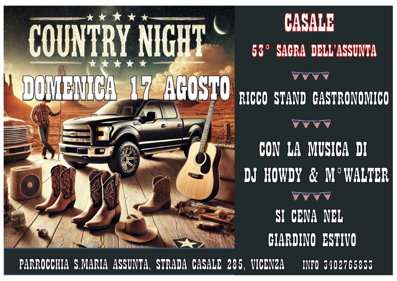 Country Night alla Sagra di Casale Vi Dj Walter e Howdy Dj ci porteranno a ballare insieme ai Country Dance School in un’oasi verde immersi nel fresco giardino della Parrocchia.